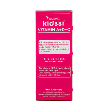 دايونيكس كيدزي فيتامين أ + د + سي نقط للأطفال 30 مل قطرات دايونيكس كيدزي بنكهة الفراولة المميزة بتركيبة غنية بالفيتامينات المهمة لتعزيز صحة الطفل العامة. يحتوي على: فيتامين د: يعزز امتصاص الكالسيوم والفوسفور، ويحافظ على تركيزات الكالسيوم في الدم مما يساعد على تقوية العظام والأسنان ودعم النمو السليم للطفل. فيتامين أ & سي: يعززان من وظائف الجهاز العصبي والأعصاب ولا سيما فاعليتهما في تقوية مناعة الجسم والوقاية من الأمراض.