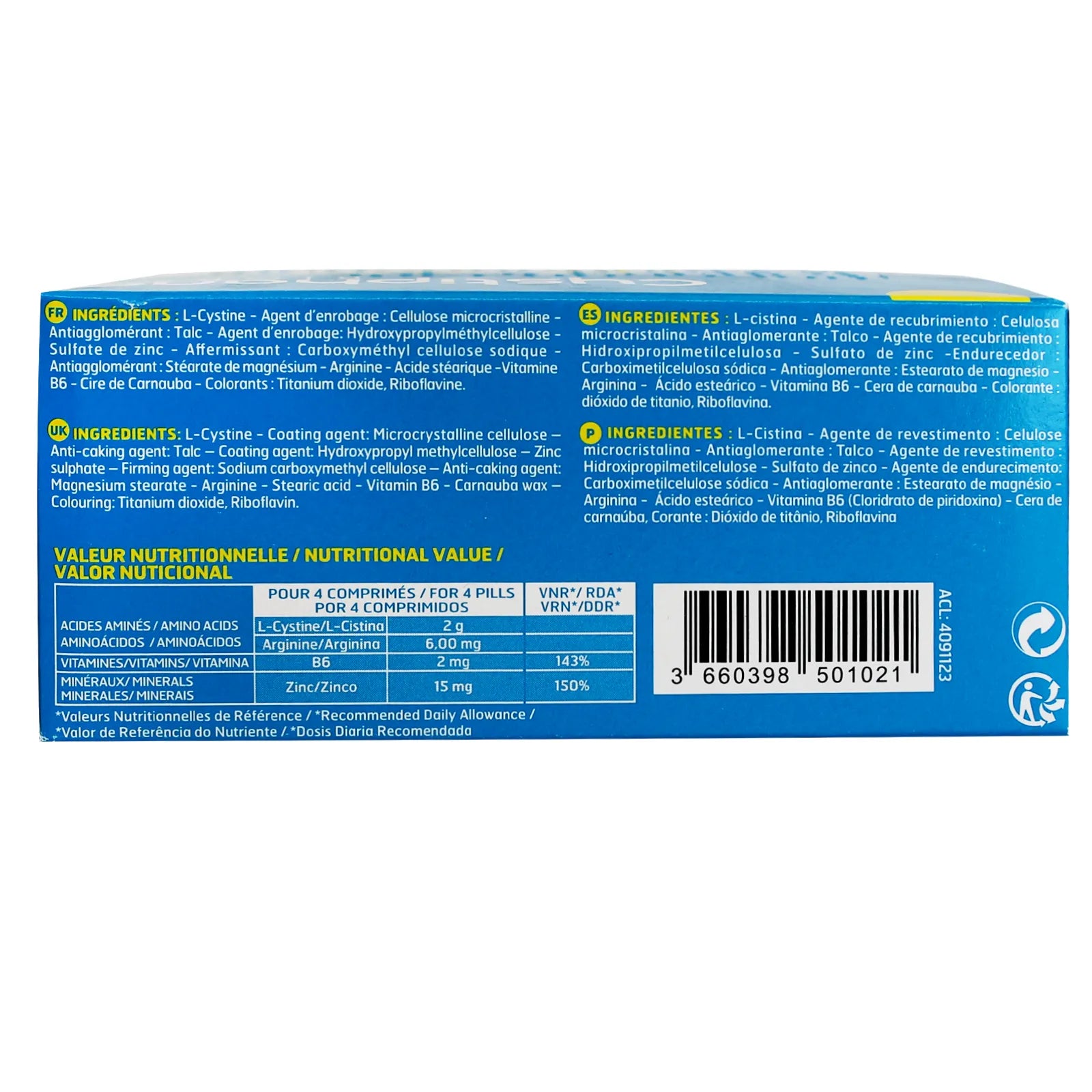• تظهر أعلى مستويات السيستين بشكل رئيسي في الشعر، بعد 4-6 أسابيع من تناول الأقراص.