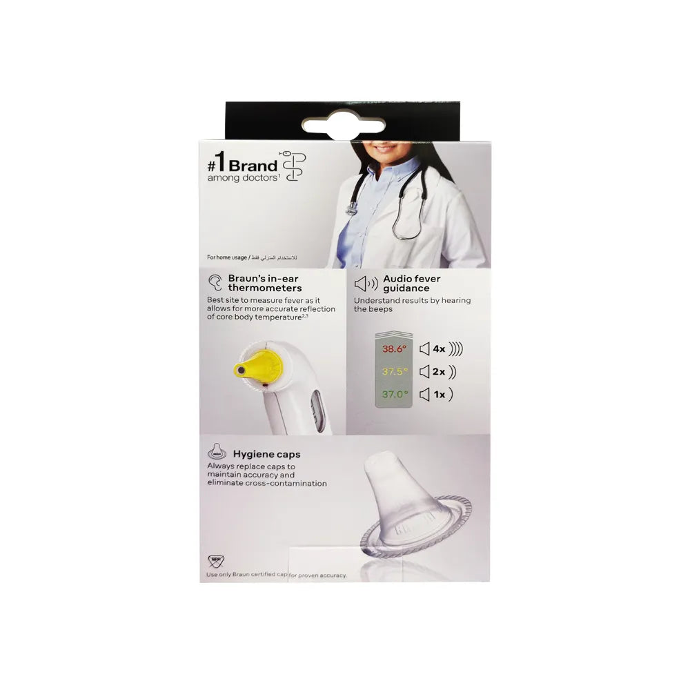 استخدم دائمًا مقياس الحرارة مع الأغطية لكل قياس لضمان الدقة، والحفاظ على النظافة، وتقليل خطر التلوث المتبادل. قد تختلف القراءات بين الأذن اليمنى واليسرى، لذا خذ دائمًا قياسات درجة الحرارة من نفس الأذن.