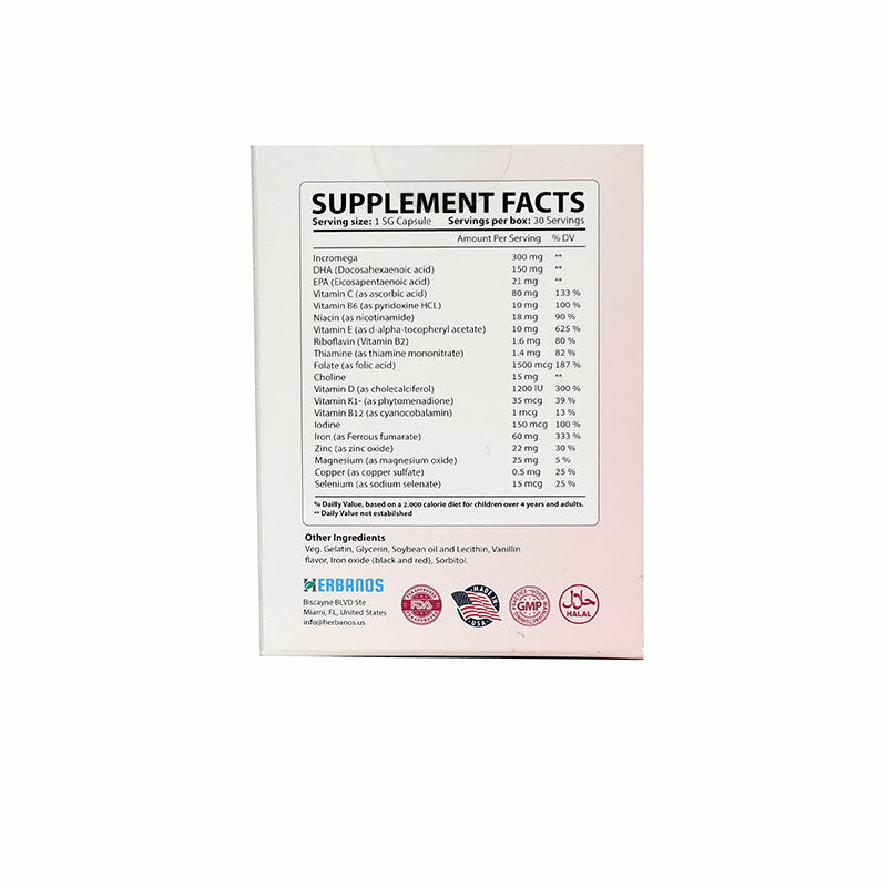 - أوميغا 3 (DHA) الذي يساهم في النمو الطبيعي للدماغ والعين لدى الجنين ولتعزيز الرضاعة الطبيعية.