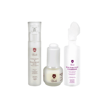 The package contains a Skin Cleanser, a Retinol serum that rejuvenates the skin, and a Collagen and Hyaluronic Serum that gives you baby-like skin.