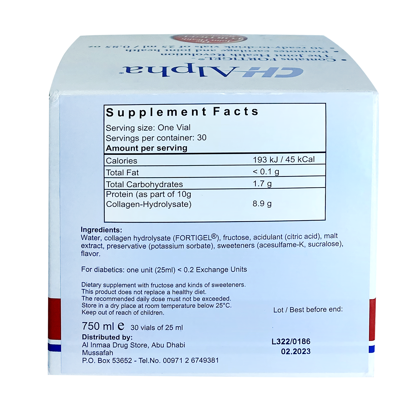 CH Alpha is an oral collagen vials that help in regenerate the natural cartilage (a kind of dense connective tissue that lies between the joints of the bone). CH-Alpha is a highly effective, very convenient, and pleasant-tasting formulation that act by stimulating the synthesis of new joint cartilage and help produce collagen, which forms 70% of the components of cartilage and maintain the flexibility of joints, which make movement both smoother and more comfortable.